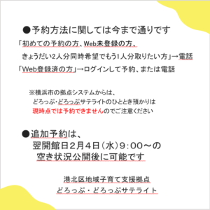 ◆追加予約は、翌開館日2月4日(水)9:00~の 空き状況公開後に可能です