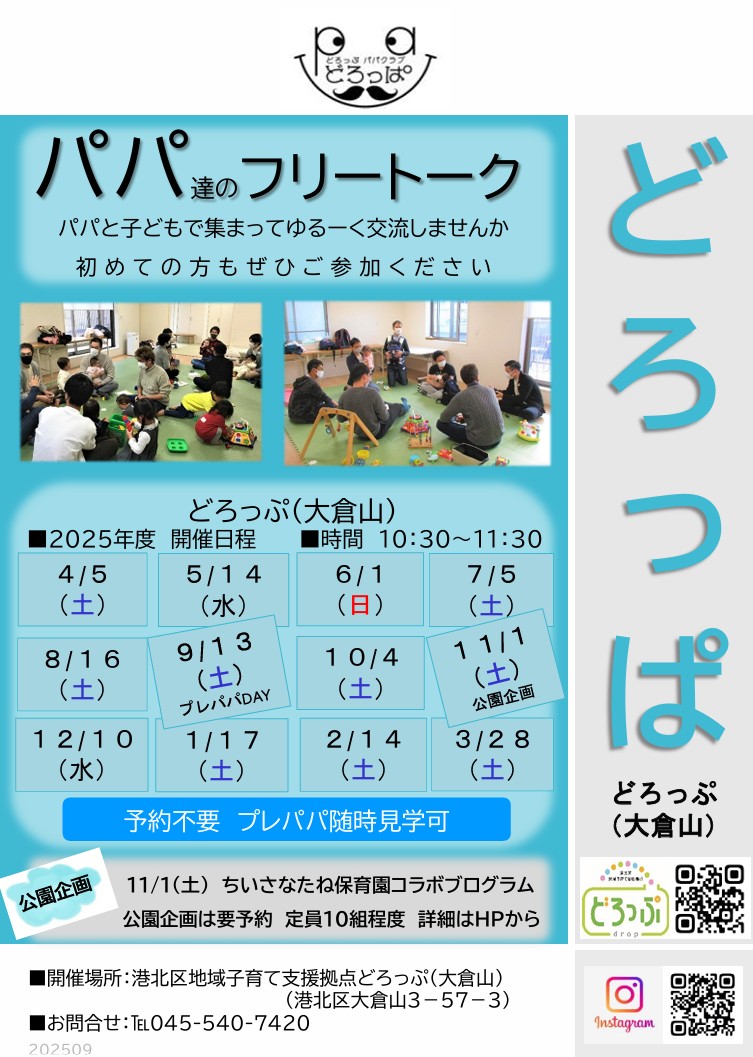 11月1日(土)どろっぷ(大倉山)開催は上記、公園遊びとなり、ひろばでの開催はありません。