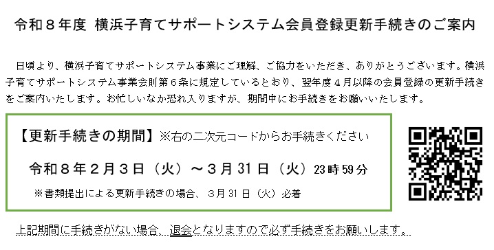 お知らせ 子育てサポートシステム 令和8年度 (2026年度)【子サポ】更新手続きのお知らせ 令和8年度(2026年度)【子サポ】更新手続きのお知らせ 2026年2月3日からスタートします。 ★ ログイン方法詳細 ←こちらをクリック ★ 年度更新手続き詳細 ←こちらをクリック メールアドレスの登録が不明など、 手続きに関するお問い合わせは港北区支部までお電話ください。 港北区支部 TEL 045-547-6422 カテゴリ:お知らせ, 子育てサポートシステム 前 ココアプリ – 2026.1.29 配信分 次 ココアプリ – 2026.2.5 配信分