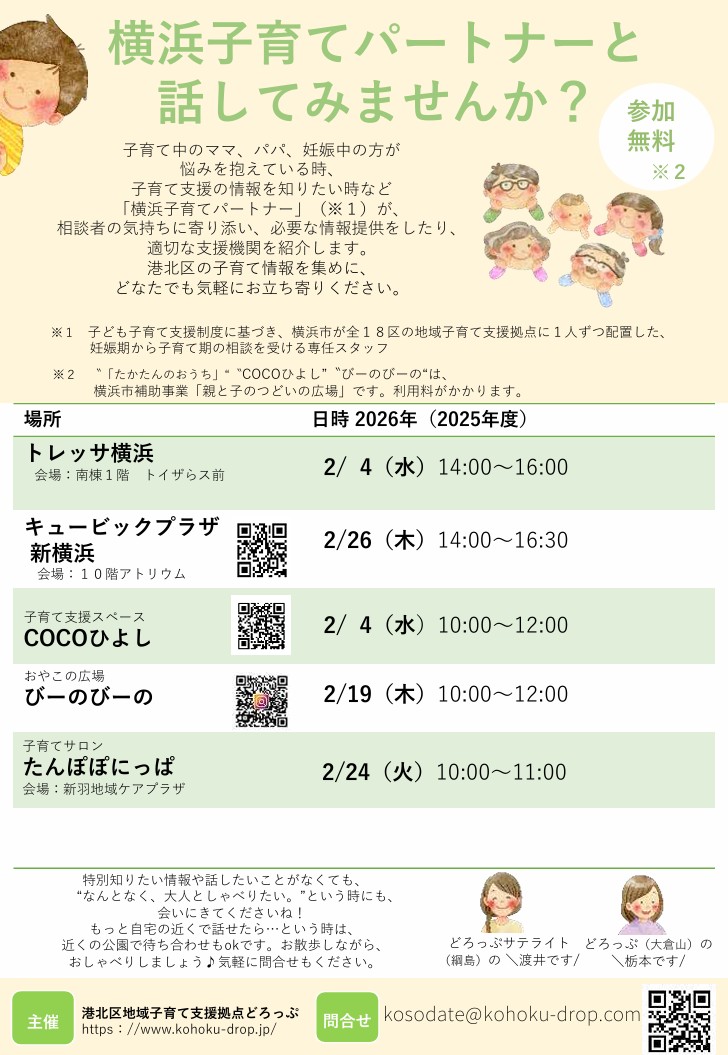 子育て中のママ、パパ、妊娠中の方が悩みを抱えている時、 子育て支援の情報を知りたい時など「横浜子育てパートナー」が、 相談者の気持ちに寄り添い、必要な情報提供をしたり、適切な支援機関を紹介します。 港北区の子育て情報を集…