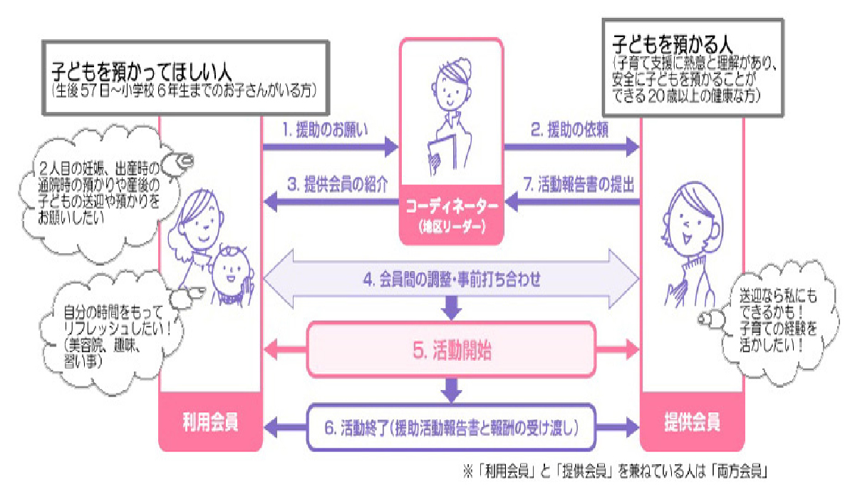子育てサポートシステムの仕組みや「利用会員」の利用の流れ、「提供会員」の活動をご紹介しています。