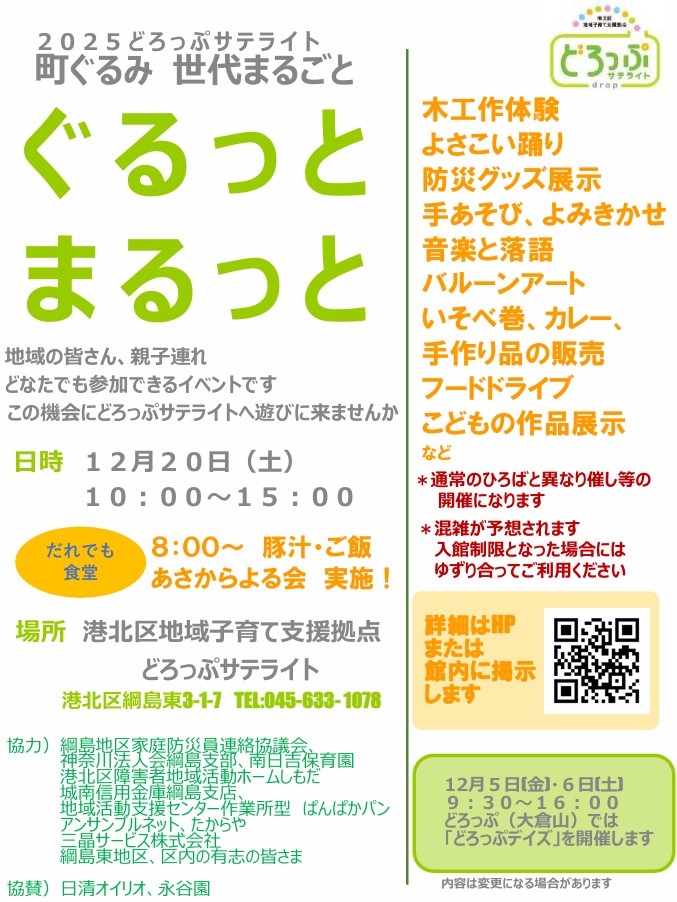 2025 ど ろ っ ぷ サ テ ラ イ ト 町 ぐ る み 世 代 ま る ご と ぐ る っ と ま る っ と 地域の皆さん、親子連れ、どなたでも参加できるイベントです この機会にどろっぷサテライトへ遊びに来ません…