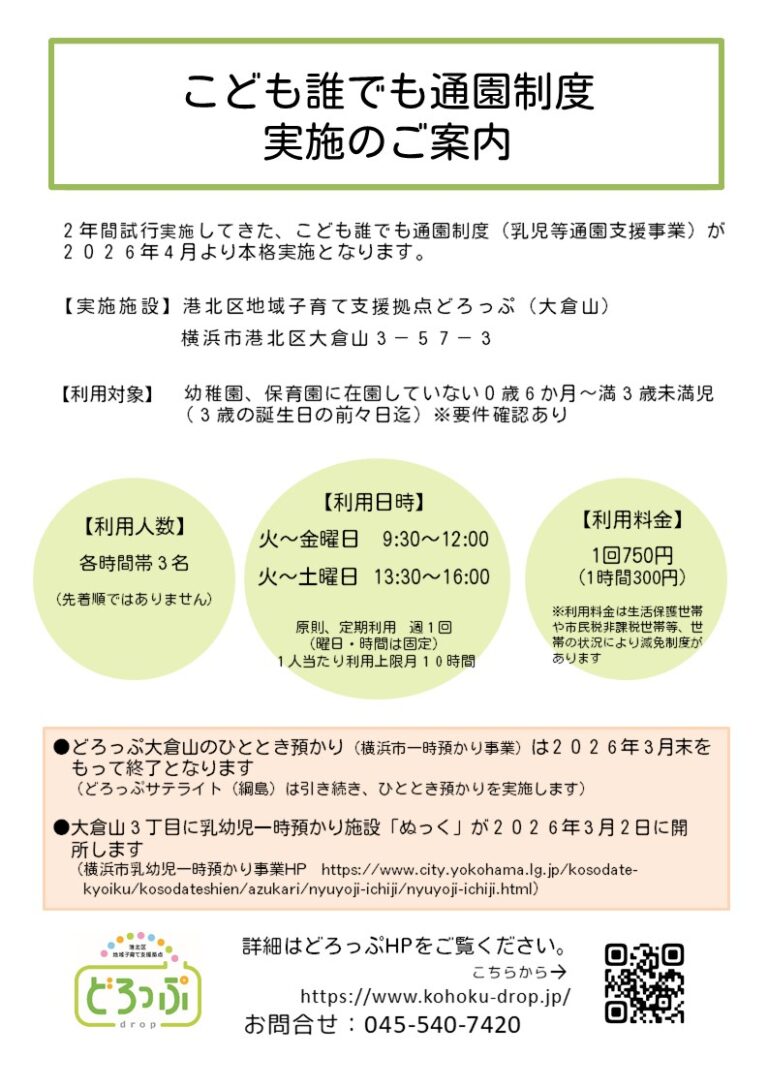 2年間試行実施してきた、こども誰でも通園制度(乳幼児等通園支援事業)が 2026年4月より本格実施となります。 【実施施設】港北区地域子育て支援拠点どろっぷ(大倉山) 横浜市港北区大倉山3‐57‐3 【利用…