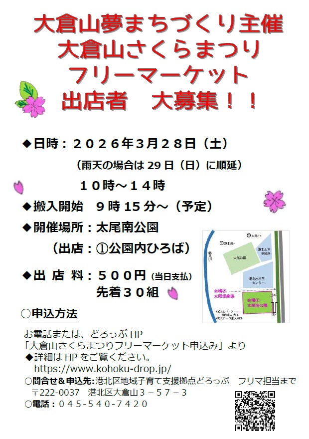 大倉山夢まちづくり主催 大倉山さくらまつりフリーマーケット ◆日時:2026年3月28日(土) 10時~14時 ※雨天順延(3月29日(日)) ◆搬入開始 9時15分~(予定) ◆開催場所:太尾南公園 (出店:①公園内ひ…