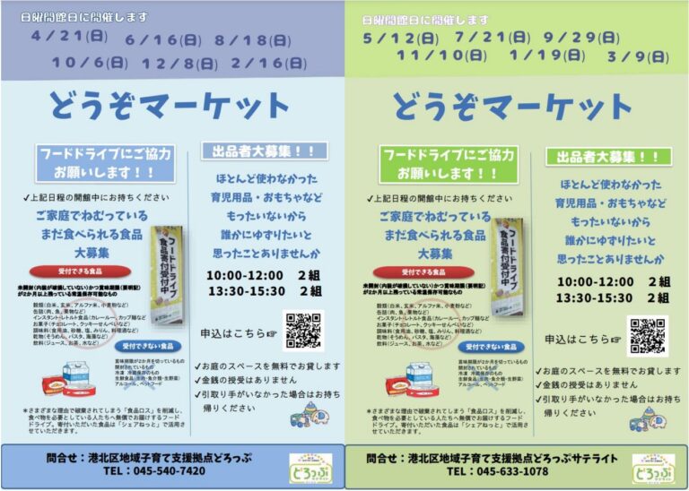 出品者大募集!! フードドライブにもご協力お願いいたします。 ほとんど使わなかった育児用品・おもちゃなど、もったいないから誰かにゆずりたいと思ったことありませんか? ◇どろっぷ・サテライトのお庭のスペースを無料でお貸しし…